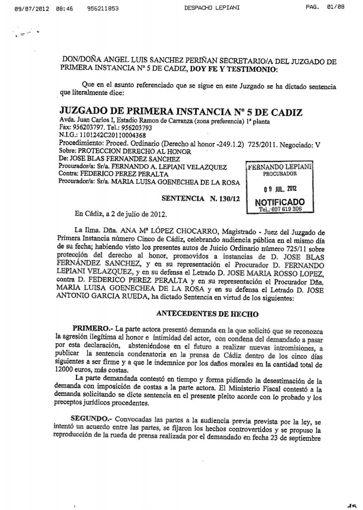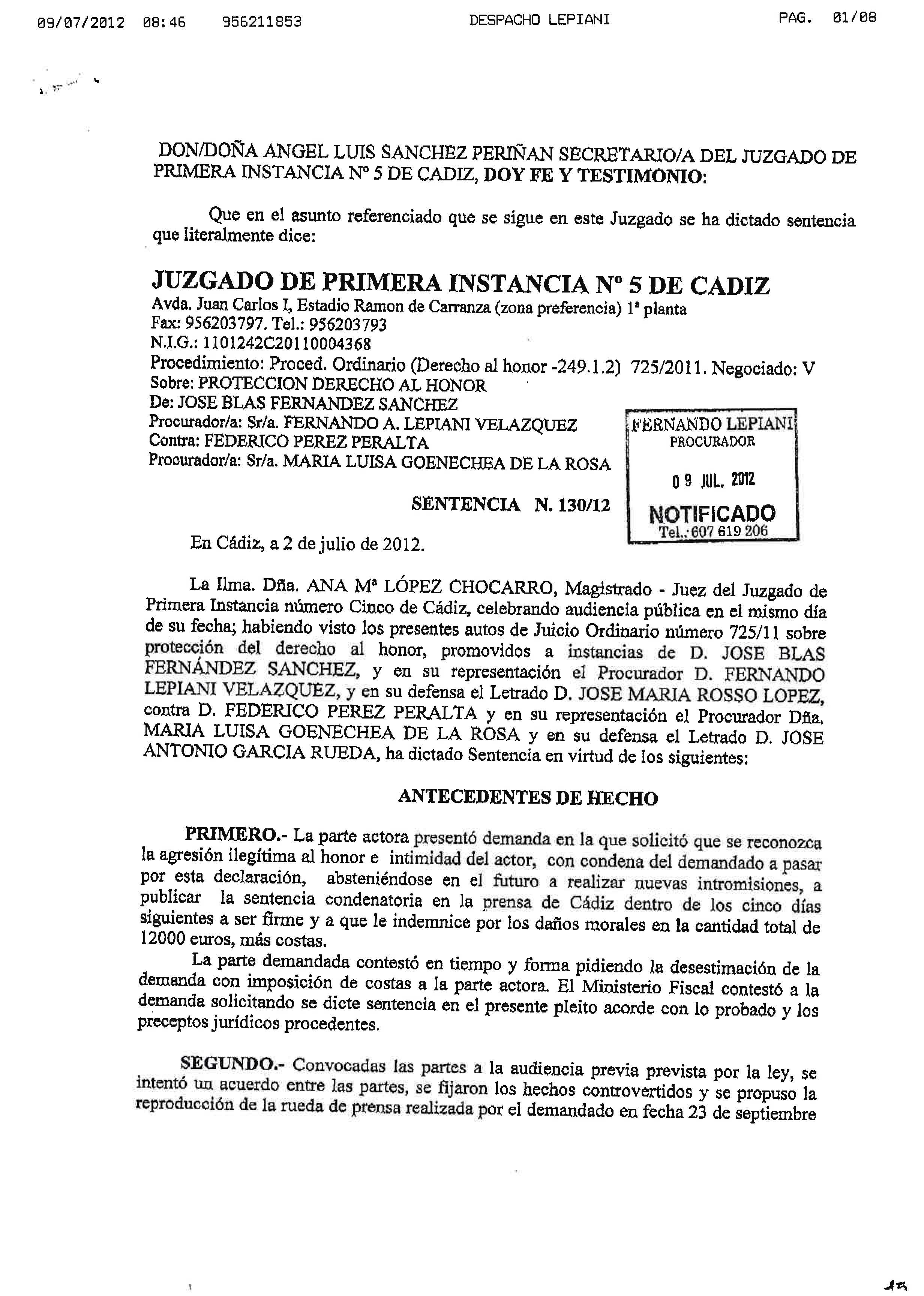 Sentencia de condena a Pérez Peralta por intromisión en mi honor